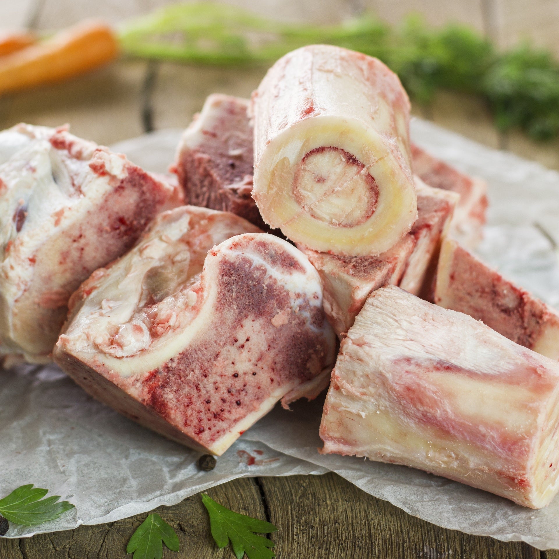 These are a selection of beef bones. The marrow has been removed from these bones.